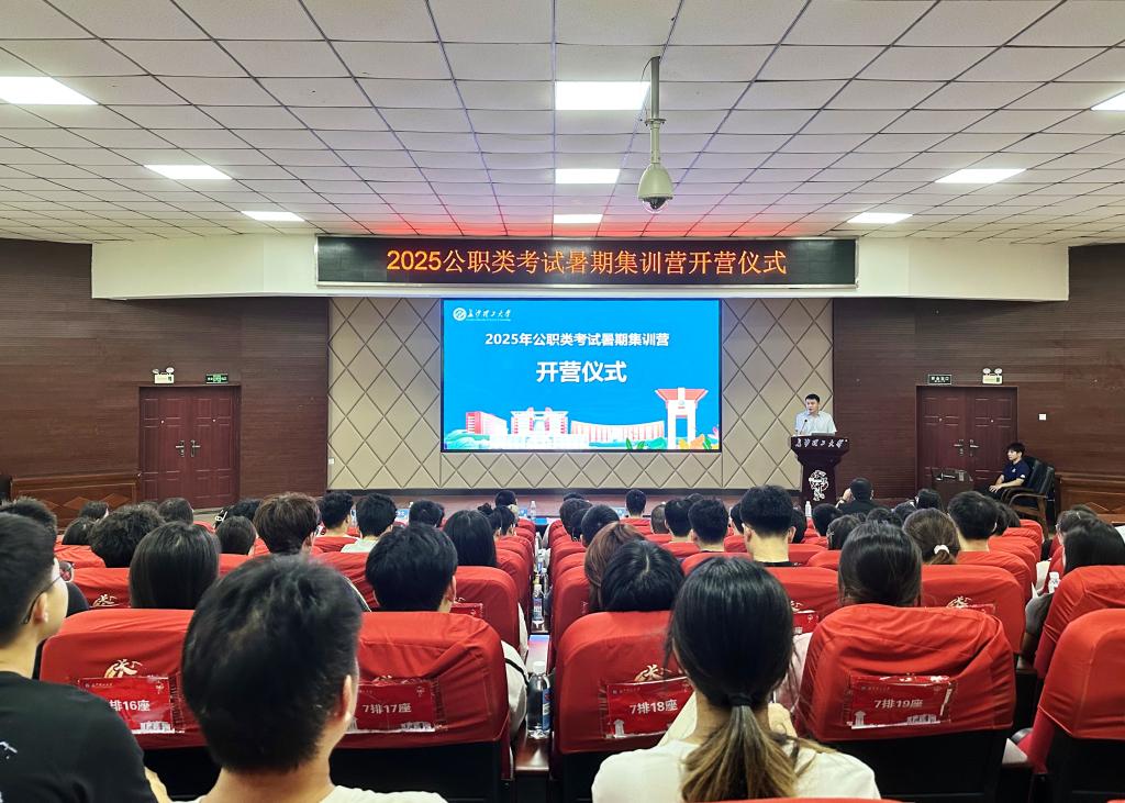 7月12日,MG冰球官网2025年公职类考试暑期集训营开营仪式在云塘校区文科楼报告厅举行。学校创业就业指导处处长田上、创业就业指导处蔡翔羽老师、水利学院2020届校友夏建杰、交通学院2021届校友贺治宇、机械学院2023届校友孙泽文、文新学院2024届校友周旺、教师代表李艳春、梁力丹以及全体集训营学员参与活动。