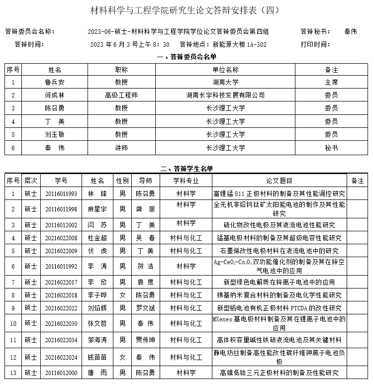 材料科学与工程学院第四组答辩安排表
