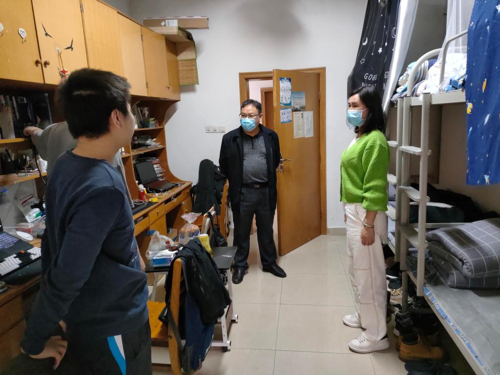 随后,学院领导深入走访学生宿舍,唐超文与学生亲切交谈,询问毕业生的毕业论文进展情况、考研复试和就业情况,提醒同学们要按时进行易班打卡,出入公共场所要戴口罩、加强防护、注意宿舍用电安全。此外,唐超文也对学生关于复试体检、外出参加考试等问题给予解答,唐超文表示,同学们的切实需求,学院会详细研判,结合疫情防控的形势,尽量满足同学们的合理要求,让同学们安心备考,不用担心。同时,陈华表示,希望同学们积极配合学校疫情防控工作,遇到问题或突发情况及时与辅导员沟通,展现毕业生的良好风貌,为低年级同学做好榜样。