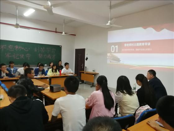 会上,三位老师从为什么要开展主题教育、主要内容是什么以及习近平新时代中国特色社会主义思想的核心要义进行了详细的解读,通过大量的事例、深入浅出的阐释了新时代通过学习新思想武装头脑的必要性。侯伟健讲述了“不忘初心、牢记使命”的深层内涵,就《习近平关于“不忘初心、牢记使命”论述摘编》进行了详细的解读,并联系学校的发展变化以及青年学生的使命鼓励同学们坚定理想信念,树立好人生观、世界观和价值观,争做“有理想、有信念、有家国情怀”的爱国青年;许建兰讲解了马克思主义在中国的传播和党的发展历程,以共和国勋章张富清老英雄的故事寄语学生要做奋斗者,以青春书写自己的历史;曾兰桂从国家、社会、个人三个层面介绍了不忘初心的必要性,结合新中国成立70周年的发展历程引导同学们不忘初心、牢记使命,刻苦学习、努力成才,将个人理想融入民族复兴伟大理想和中国特色社会主义思想,在复兴的壮阔征程激扬青春力量。