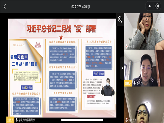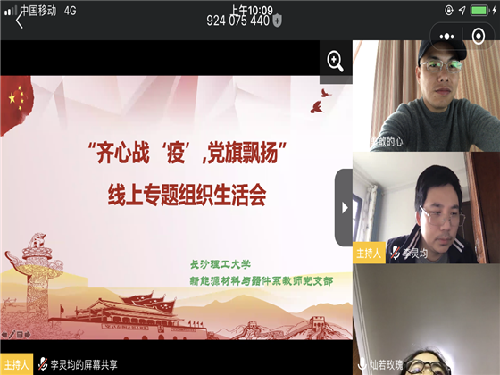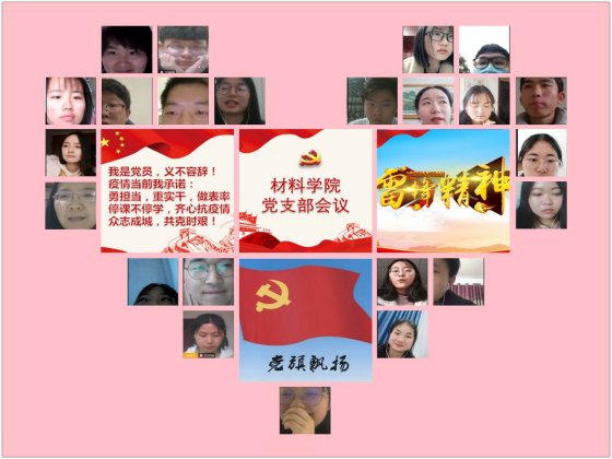 为坚决贯彻落实习近平总书记对新型冠状病毒感染肺炎疫情的重要指示精神,充分发挥特殊时期材料学院党总支战斗堡垒作用和党员先锋模范带头作用,号召学院全体党员不忘初心、牢记使命,落实好立德树人根本任务,全力以赴保障疫情防控期间学院工作的有序高效运行,全面助力打赢疫情防控阻击战。根据学校《关于在基层党支部召开“齐心战‘疫’、党旗飘扬”线上专题组织生活会的通知》精神和要求,材料学院各党支部在本周陆续召开了“齐心战‘疫’,党旗飘扬”线上专题组织生活会,会议由各支部书记主持,全体教工党员及学生党员均参加了线上视频会议。