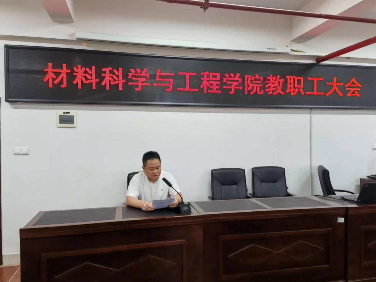 7月6日材料科学与工程学院在新能源大楼1-302召开全体教职工大会,大会由院党总支副书记陈华主持,学院全体教职工参加。