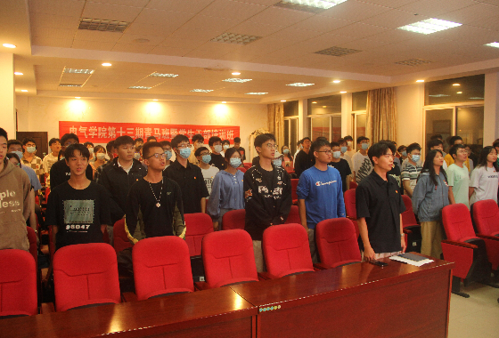 仪式伊始,全体成员共唱中国共产主义青年团团歌,歌声嘹亮,气势如虹。电气学院执行主席刘晨阳宣读《学员纪律》。紧接着,往期学员代表罗翔分享经验,他指出作为学生干部要明确学干身份,踏实做好本职工作,严格遵守校纪校规,在实践中学习,提升自身的切实能力。随后,张一鸣宣布开班并提出要求。内容主要有四点:一是坚定理想,不懈奋斗;二是树立目标,学有所成;三是以身作则,亮出旗帜;四是纪律严明,态度端正。