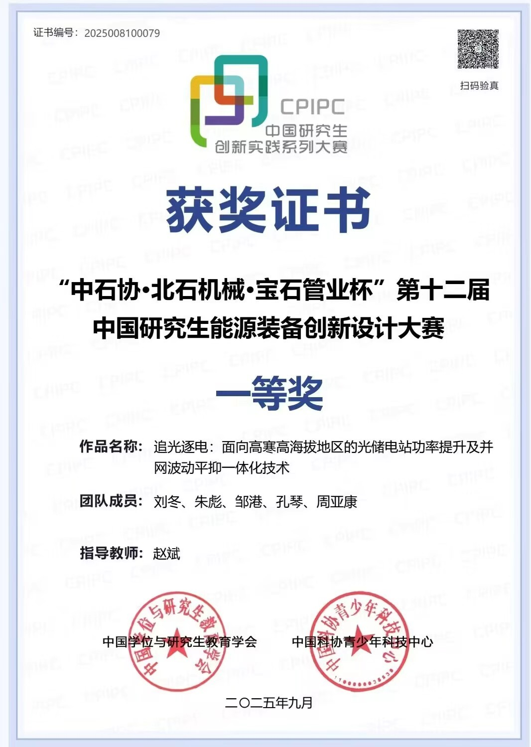 9月18日至21日,第十二届中国研究生能源装备创新设计大赛全国总决赛在昆明理工大学隆重举行。赵斌教授指导的团队凭借作品《追光逐电:面向高寒高海拔地区的光储电站功率提升及并网波动平抑一体化技术》,从全国众多参赛队伍中脱颖而出,斩获全国一等奖!同时赵斌教授也荣获“优秀指导教师”称号。