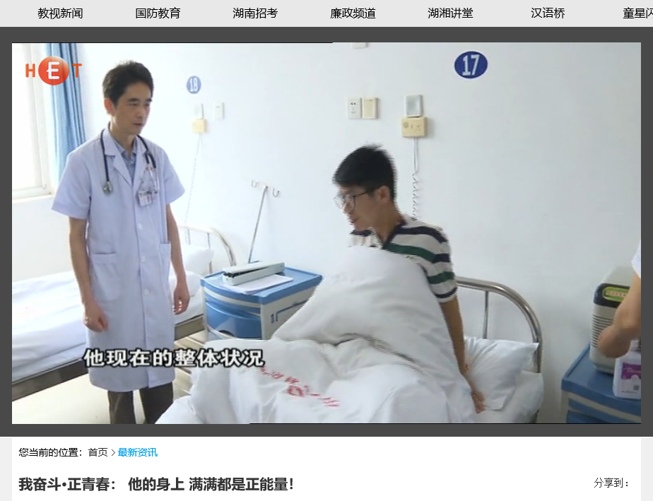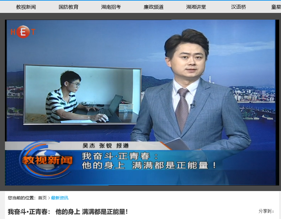 6月10日湖南教育电视台首页最新资讯,以《我奋斗·正青春:用行动丈量生命的厚度》为题对MG冰球官网计算机与通信工程学院15级研究生邹勇松进行了报道。