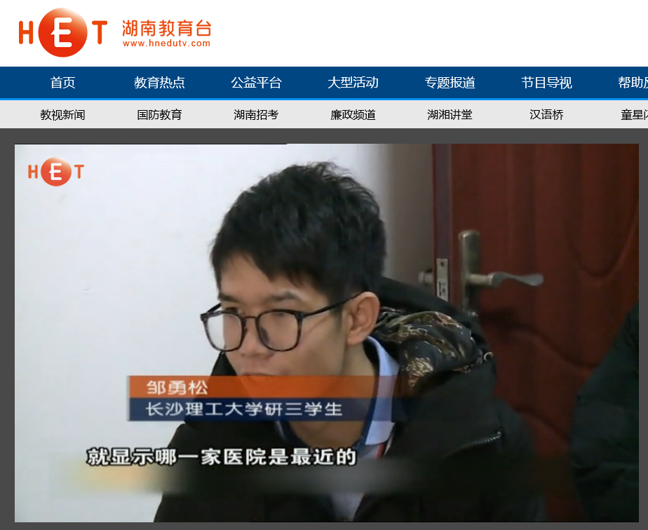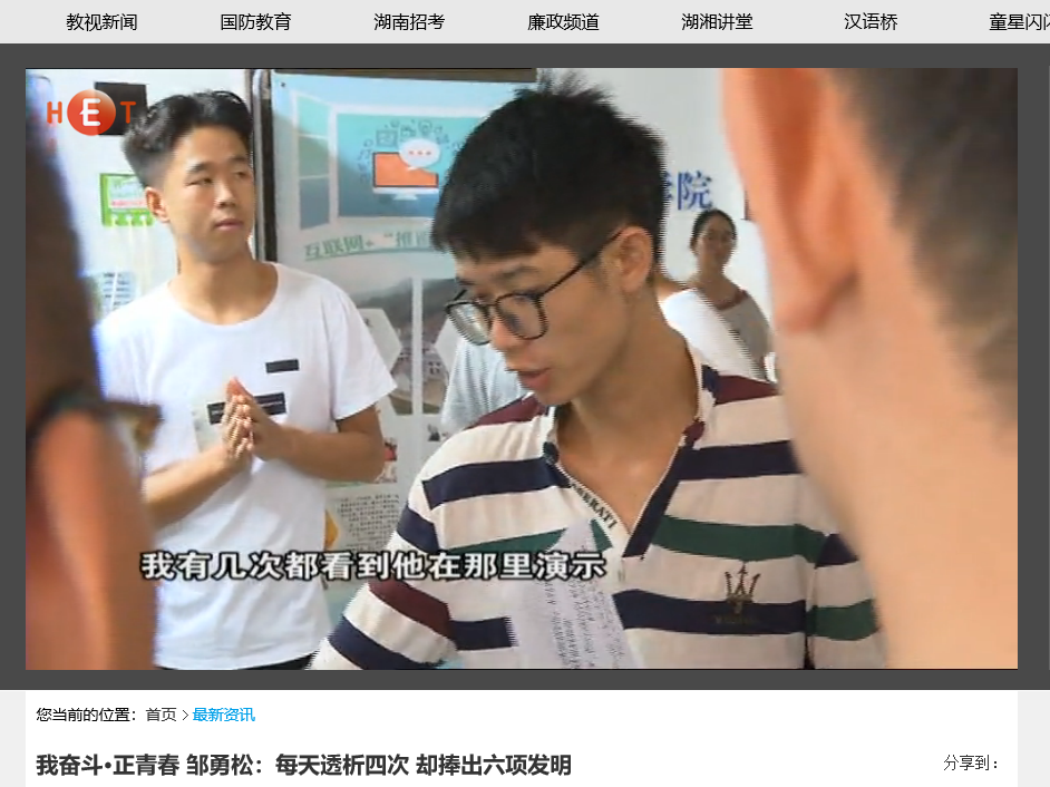 6月9日湖南教育电视台首页最新资讯,以《我奋斗 正青春 邹勇松:每天透析四次,却捧出六项发明》为题对MG冰球官网计算机与通信工程学院15级研究生邹勇松进行了报道。