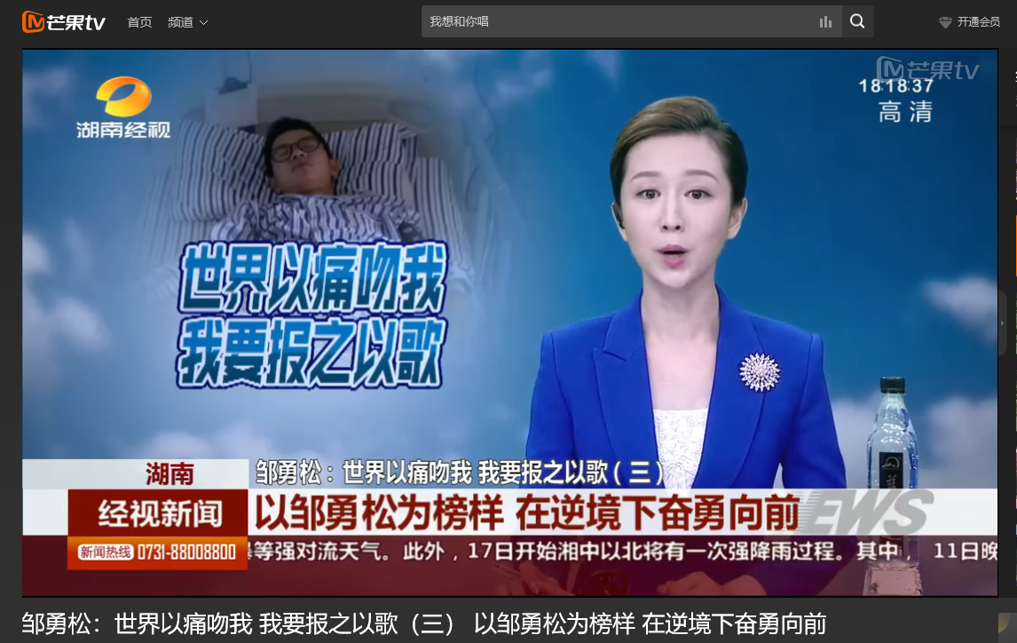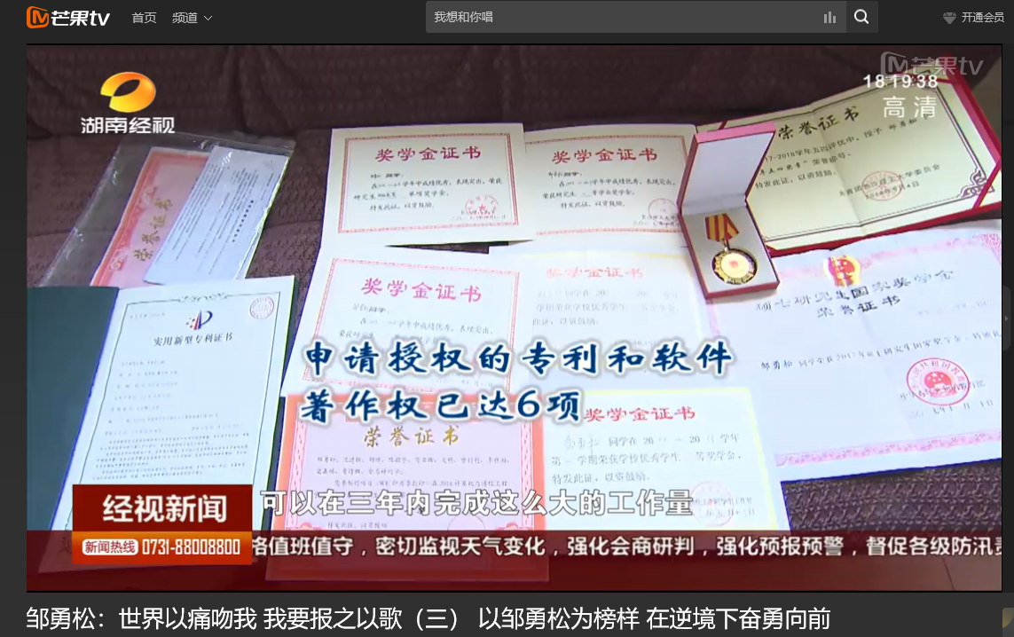 湖南经视 6月11日经视新闻,以《邹勇松:世界以痛吻我 我要报之以歌(三) 以邹勇松为榜样 在逆境下奋勇向前》为题对MG冰球官网计算机与通信工程学院15级研究生邹勇松进行了报道。