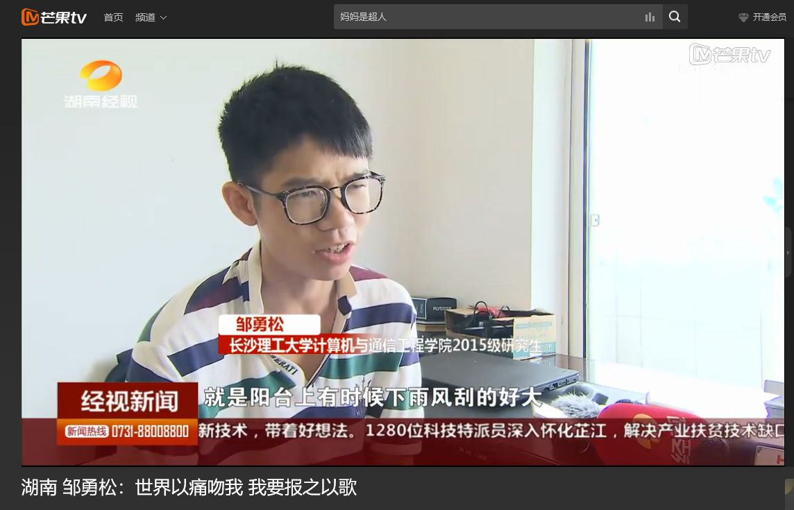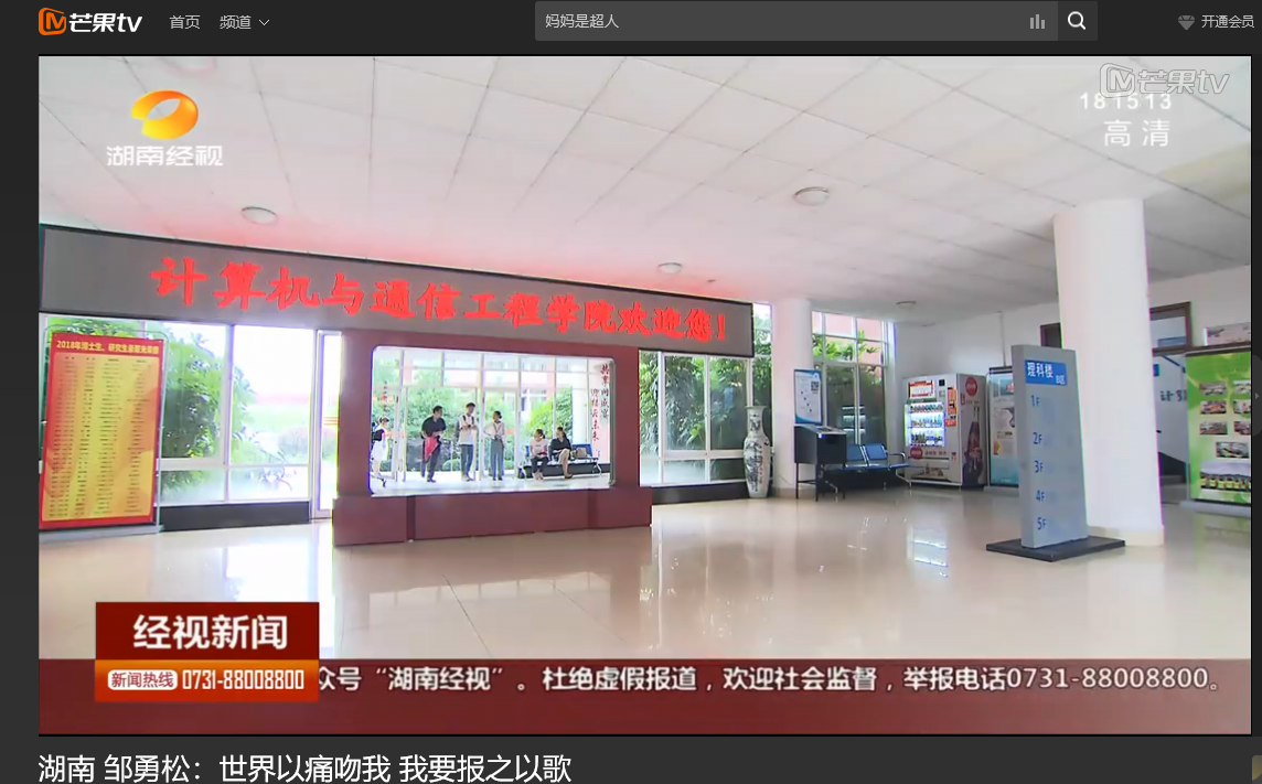 湖南经视6月9日经视新闻,以《邹勇松:世界以痛吻我 我要报之以歌》为题对MG冰球官网计算机与通信工程学院15级研究生邹勇松进行了报道。