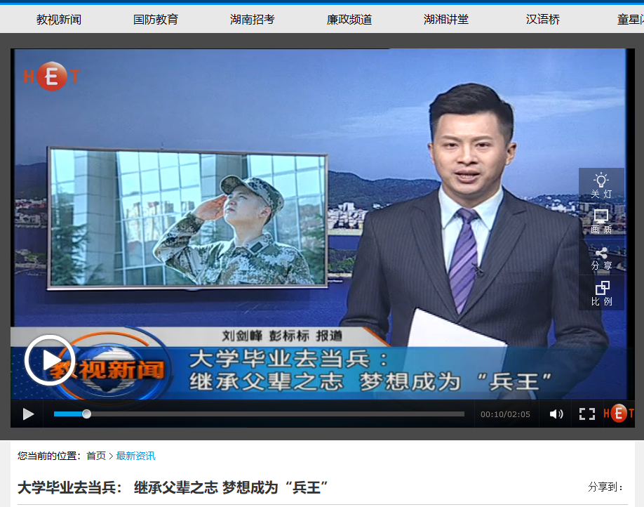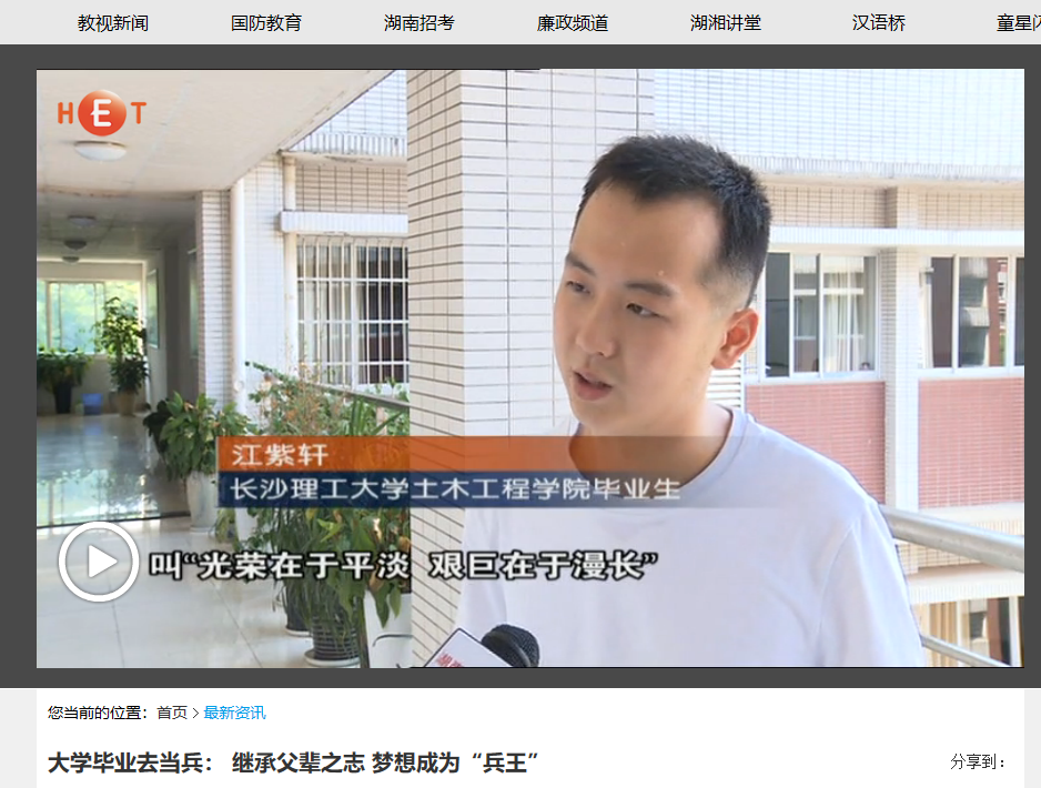湖南教育电视台7月23日教视新闻,以《大学毕业去当兵: 继承父辈之志 梦想成为“兵王”》为题对MG冰球官网MG冰球突破官网土木工程学院2018届毕业生江紫轩进行了报道。毕业前,他放弃了国企稳定的工作,填写了入伍申请,即将投身军营。