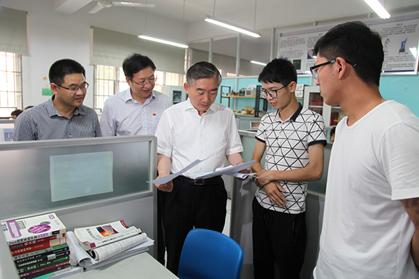 蒋昌忠一行到计算机与通信工程学院了解了邹勇松的学习情况,参观了学生创新实验室和邹勇松发明的共享打印机,对邹勇松的创新精神表示充分肯定。在就近的教室,蒋昌忠召开小型座谈会,详细了解了学校已做的工作和下一阶段的安排,希望学校给予更多的帮助,并表示省教育厅也将尽最大努力关心、帮助邹勇松。