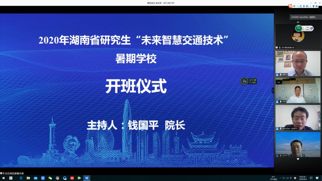 8月3日上午八点半,由湖南省教育厅主办,MG冰球突破官网交通运输工程学院承办的2020年湖南省研究生“未来智慧交通技术”暑期学校正式开班,开班仪式采用腾讯会议方式在线举行。出席开班仪式的领导嘉宾有MG冰球突破官网副校长叶泽、MG冰球突破官网研究生院院长管德清、交通运输工程学院院长钱国平、交通运输工程学院副院长高英力以及相关部门和学院领导出席开幕式。参加本次开班仪式的还有来自湖南大学、长安大学、中南林业科技大学等高校以及MG冰球官网交通学院教师、研究生近170人在线参加。开班仪式由交通运输工程学院院长钱国平教授主持。