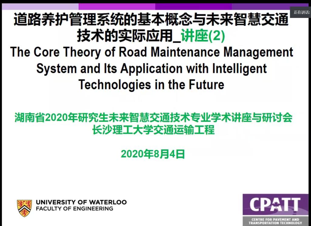 2020年8月4日上午八点,加拿大滑铁卢大学李宁远教授结合其研究领域和方向,续作了“道路养护管理系统的核心理论和未来智能化技术的实际应用”的主题授课。
