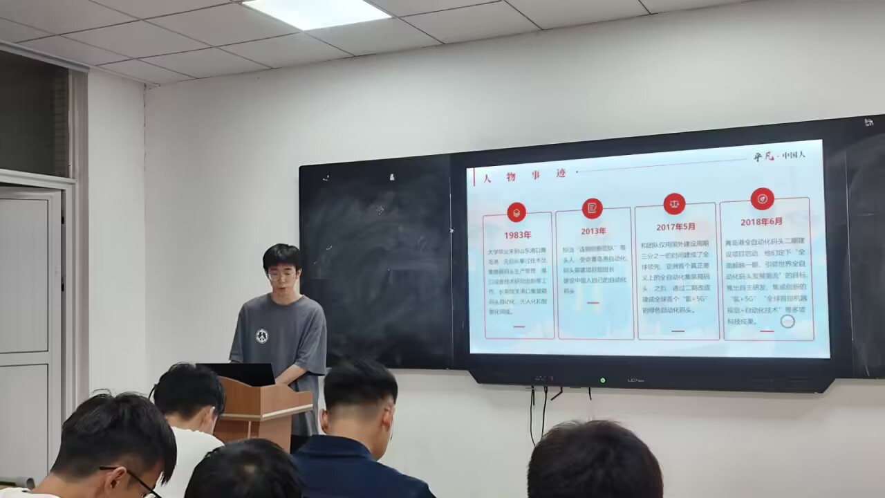 接着,李云隆同学介绍了“人民工匠”许振超的感人事迹。许振超作为青岛港的桥吊司机,带领团队九次打破集装箱装卸的世界纪录,创造了“振超效率”。李云隆通过许振超的故事,生动展示了工匠精神在实际工作中的具体体现,激励大家在自己的岗位上做到极致。
