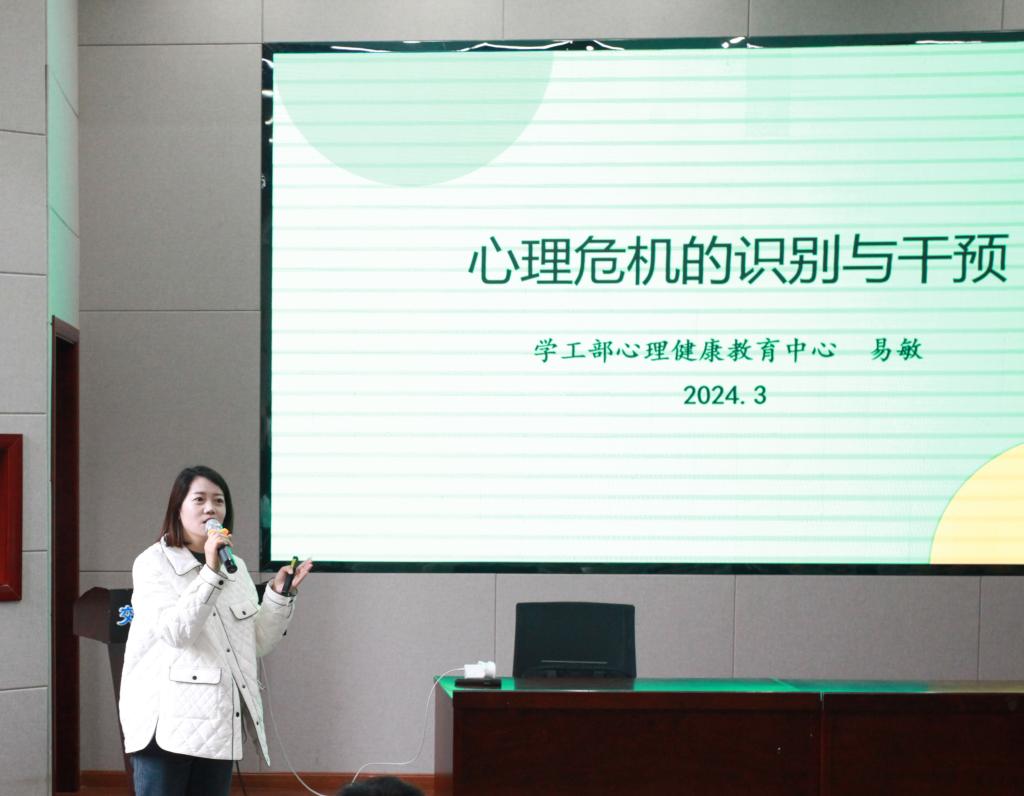 最后,学工部心理健康教育中心主任易敏开展了班主任、导师心理健康知识培训,易敏从实例介绍出发,对当下大学生心理问题识别,心理障碍和疾病以及心理危机三个方面入手,指导老师们如何判断并处理学生心理问题。这次培训提高了老师们的心理健康知识素养,使他们更加全面地了解了心理健康知识,提高应对班级心理健康事件的识别转介能力。