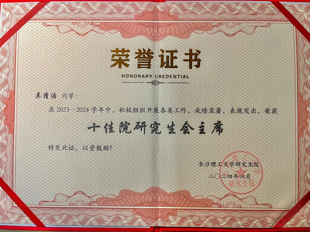 近日,MG冰球突破官网第十八次研究生代表大会闭幕式在云塘校区召开,现场对2023-2024年度表现突出的优秀学生会组织进行了表彰。交通学院研究生会再次获得年度“优秀院研究生会”称号,院研究生会执行主席吴清浩获评“十佳院研究生会主席”。