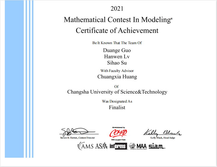 近日,2021年美国大学生数学建模竞赛结果正式公布。MG冰球官网共获得特等奖提名奖(Finalist)1项和二等奖(Honorable Mention)6项的好成绩。数学与统计学院黄创霞教授指导的郭端格、吕翰文、苏思浩3名同学组成的代表队获得此次竞赛的特等奖提名奖, 实现了学校在此项比赛上的突破。