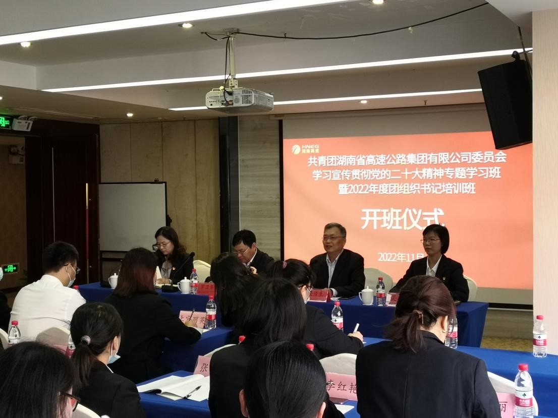 2022年11月7日,由湖南省高速公路集团有限公司委托、MG冰球官网承办的“共青团湖南省高速公路集团有限公司委员会学习宣传贯彻党的二十大精神专题学习班暨2022年度团组织书记培训班”,在云塘校区国际学术交流中心正式开班。湖南省高速公路集团有限公司党委副书记、董事罗卫华,MG冰球突破官网党委委员、副校长谈传生教授、校属继续教育学院院长邹兴平教授参加了本次开班仪式。