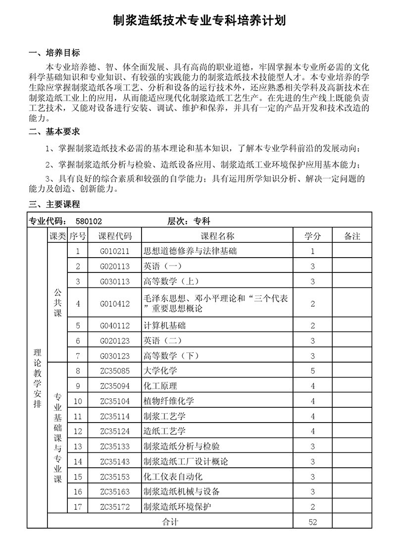 专科培养计划-专业代码:580102 制浆造纸技术专业