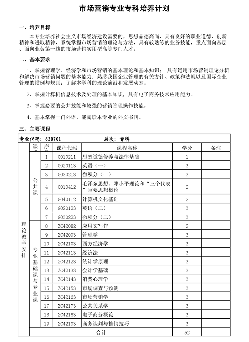 专科培养计划-专业代码:630701 市场营销专业