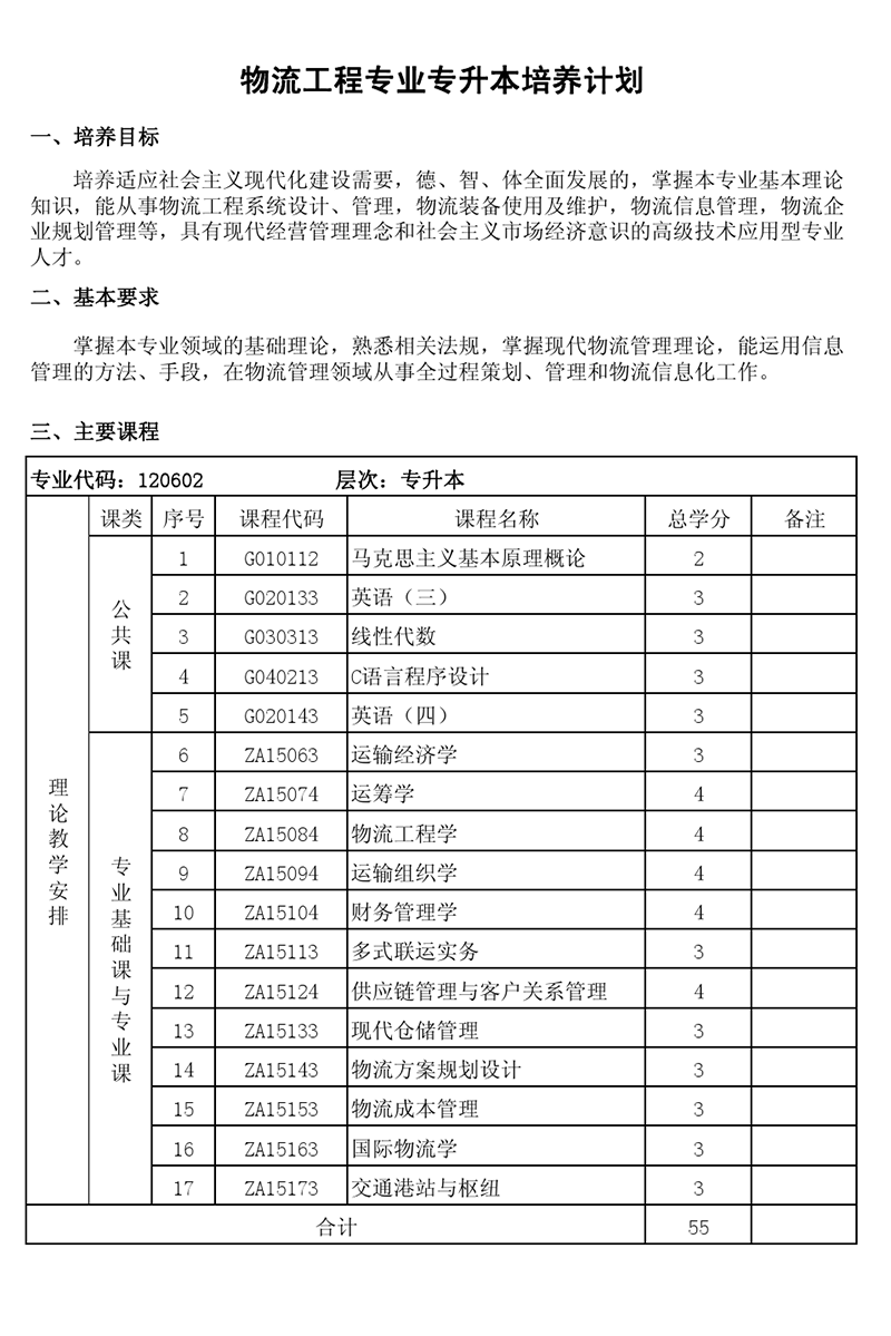 本科培养计划-专业代码:120602 物流工程专业
