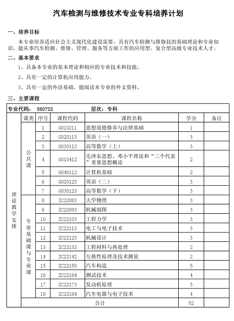 专科培养计划-专业代码:560702 汽车检测与维修技术专业