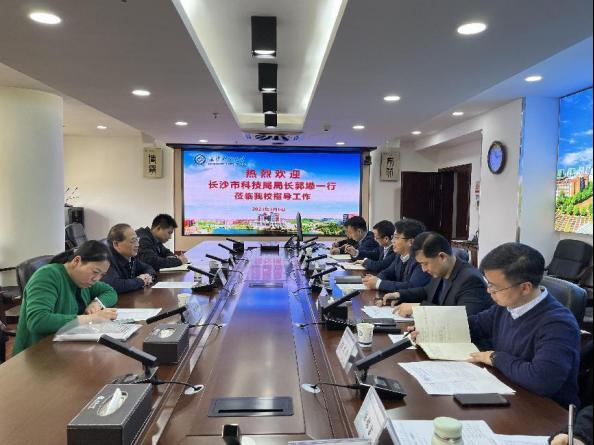 3月6日下午,长沙市科技局党组书记、局长郭塨带领市科技局科技成果与技术市场处、创新发展处相关负责人来MG冰球官网调研科技创新工作。校党委委员、副校长钱国平出席会议,科研部门相关人员参加了座谈会,会议由科研部部长王进主持。