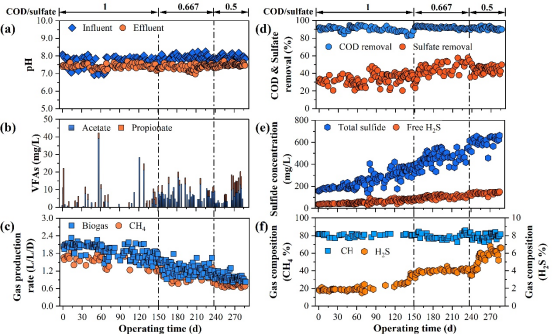 研究发现,整个实验过程中UASB反应器的COD去除率保持在90%以上,但由于硫酸盐还原菌(SRB)和产甲烷古菌(MPA)之间的复杂竞争,导致产气率下降了52%。污泥特性和微生物群落特征表明,SRB和MPA之间存在着复杂的竞争,包括对反应器内氢气和生存空间的竞争。此外,SRB对电子的竞争优势导致反应器中产生了更多的硫化物,进一步抑制了MPA的活性。因此,厌氧处理低COD/硫酸盐比味精废水的反应器内的复杂抑制机制包括硫化物毒性抑制、SRB和MPA对基质和空间的竞争等,这不仅导致了产气量的降低,还影响了微生物活性和谷氨酸的降解。