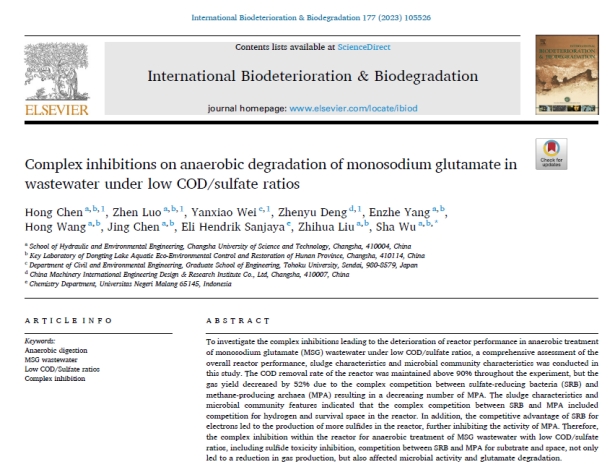 引用格式:Chen, H., Luo, Z., Wei, Y., Deng, Z., Yang, E., Wang, H., Chen, J., Hendrik Sanjaya, E., Liu, Z., Wu, S., 2022. Complex inhibitions on anaerobic degradation of monosodium glutamate in wastewater under low COD/sulfate ratios. International Biodeterioration & Biodegradation, 177, 105526.
