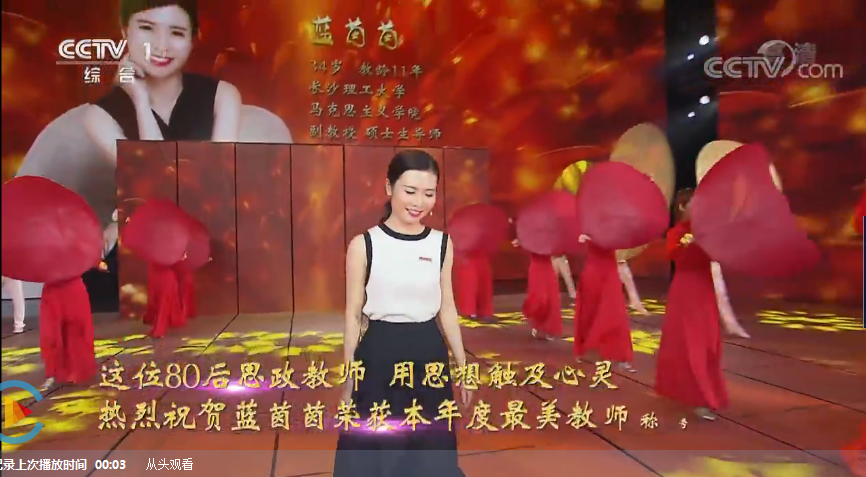 9月10日晚8点,中央广播电视总台综合频道(CCTV-1)播出教师节特别节目《2018年度“寻找最美教师”大型公益活动颁奖典礼》,MG冰球官网马克思主义学院思政课教师蓝茵茵被评选为10名全国最美教师之一。