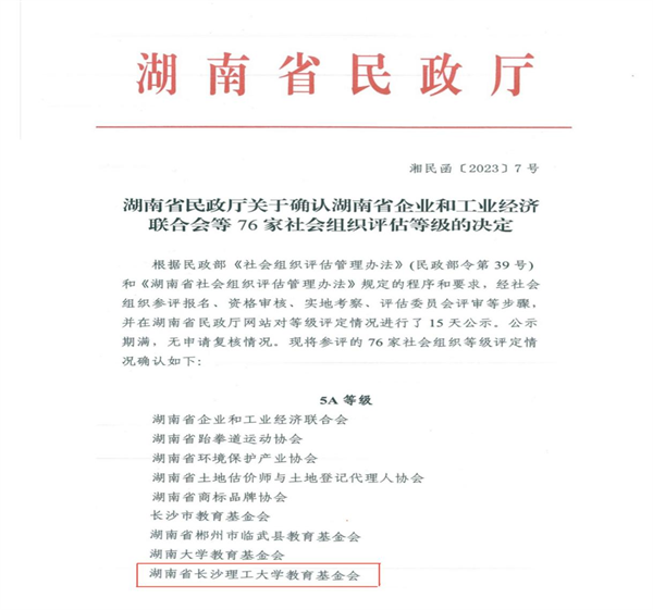 近日,湖南省民政厅发布2022年度省管社会组织评估等级结果,“湖南省MG冰球突破官网教育发展基金会”获评全省最高等级的“5A级社会组织”。今年全省有76家社会组织参评,其中获评5A等级社会组织的共21家,全省高校基金会仅两家。