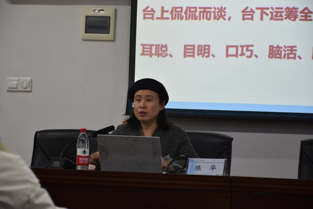 课程开始,陈华首先向在场的学员提出三个问题:什么是学生干部、为什么要做学生干部和怎样成为一名优秀的学生干部,引发学员思考。随后,陈华从三部分展开授课内容。第一,新时期学生干部画像。新时期的学生干部应该具有耳聪、目明、口巧、脑活和腿勤的特点,要有根据实践经验一步一步提高个人能力。第二,增强“四力”。强调了眼力准、脑力活、笔力强、脚力稳的重要性,并向学员们说明如何增强“四力”。第三,涵养“四气”,积淀内在素养。希望学员们能有朝气、静气、正气和底气。授课过程中,陈华列举了许多生动的例子来加深学员的理解。