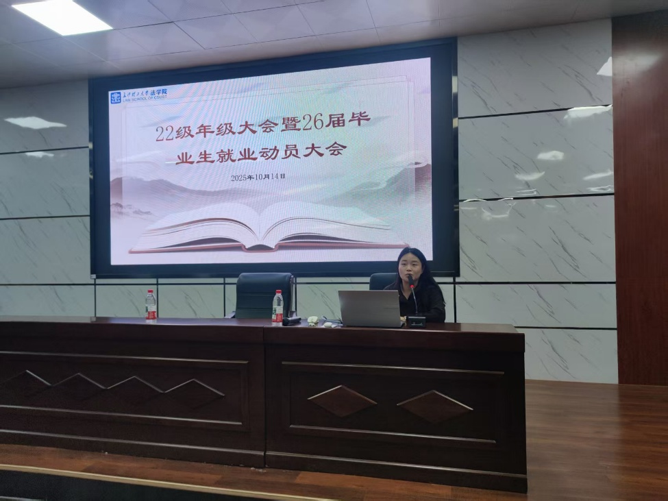 10月14日14时,法学院2026届毕业生年级大会暨就业动员大会在金盆岭校区四教学术报告厅举行。本次大会旨在进一步加强学风建设,引导学生明确学业发展方向,做好职业生涯规划。会议由毕业生年级辅导员孙佳乐主持,学院辅导员曾宇欣、2026届毕业生参加。